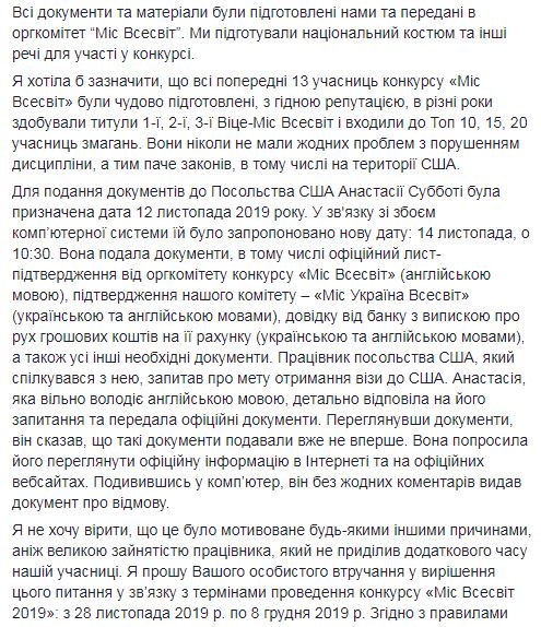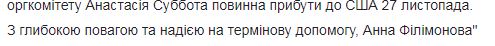Суббота должна лететь в США 27-го ноября и еще может получить визу. Но для ускорения процесса и его положительного решения Филимонова решила обратиться к послу Уильяму Тейлору. Официальное письмо Анна также разместила на страницах в Facebook.