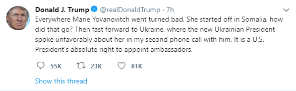 "Где бы ни работала Йованович, там все было плохо. Она начала в Сомали, и как это прошло? И то же самое в Украине, где новый президент Владимир Зеленский плохо отзывался о ее работе во время нашего телефонного разговора. Это исключительное право президента США назначать послов",  - заявил президент.
