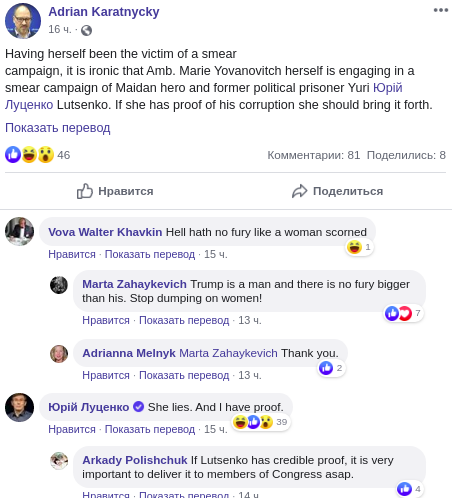 Отреагировал на слушания в конгрессе и бывший генпрокурор Луценко, которого бывшая посол назвала коррупционером. В комментариях на Facebook он обвинил Йованович во лжи под присягой и заявил, что у него есть доказательства против нее - видимо, речь о "списке неприкасаемых", о котором ранее говорил Луценко, обвиняя Йованович во вмешательстве в дела Украины и превышении власти.
