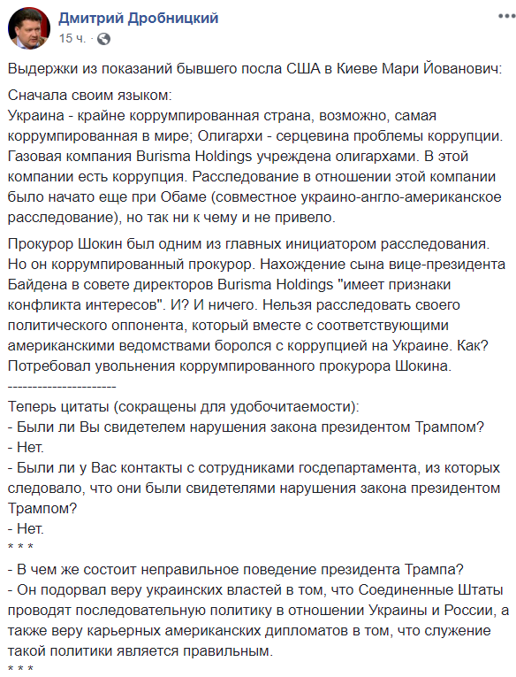 Прокурор Шокин был одним из главных инициатором расследования. Но он коррумпированный прокурор. Нахождение сына вице-президента Байдена в совете директоров Burisma Holdings "имеет признаки конфликта интересов". И? И ничего. Нельзя расследовать своего политического оппонента, который вместе с соответствующими американскими ведомствами боролся с коррупцией на Украине. Как? Потребовал увольнения коррумпированного прокурора Шокина", - написал Дробницкий у себя в Facebook.