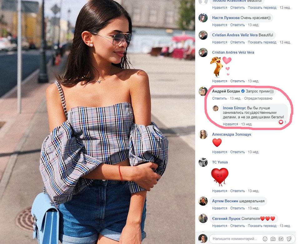 Глава Офиса президента Украины Андрей Богдан написал комментарий к посту с красивой фотографией киевлянки Маргариты Мендель в Facebook и вызвал бурную реакцию в сети.