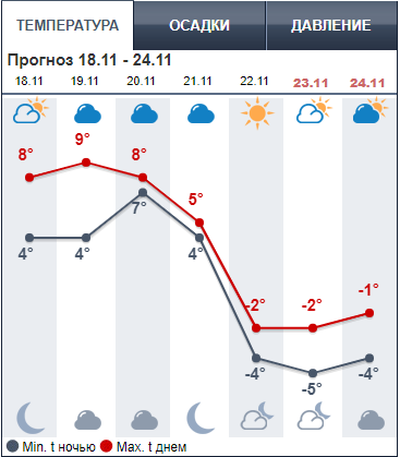 Ресурс Weather.com обещает, что самым холодным днем на этой неделе будет пятница, 22 ноября, когда температура днем будет -1, а ночью -6. В понедельник утром туман, минимальная температура около +1 ночью и днем +4.