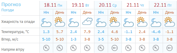Сайт Sinoptik.ua дает аналогичную погодную картину на неделю: с понедельника по среду днем будет около +6. Во вторник, 19 ноября, а также среду, 20 ноября, жителям столицы пригодятся зонты - обещают дождь. А с четверга ночью похолодает до -4...-6. А с пятницы, 22 ноября, мороз ожидается и днем: до -3...-1.