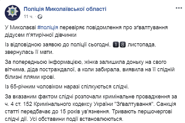 Полиция Николаева проверяет сообщение об изнасиловании 65-летним мужчиной пятилетней девочки. Об этом сообщает в Facebook отдел коммуникации полиции Николаевской области.