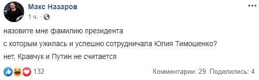 Радиоведущий Макс Назаров тоже считает, что виновата ЮВТ: "Назовите мне фамилию президента, с которым ужилась и успешно сотрудничала Юлия Тимошенко? Нет, Кравчук и Путин не считается".