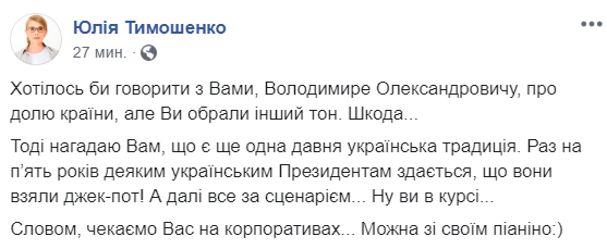 Президент после этого эфира заявил в Facebook, что Тимошенко предлагала ему договорняк: должности для членов ее партии в обмен на голосование вместе со "Слугой народа".