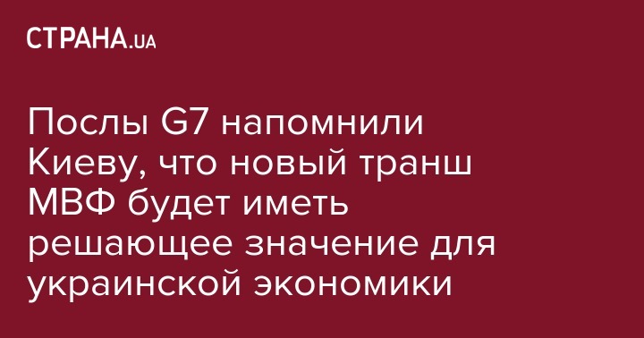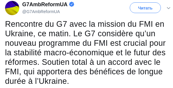 Послы стран "Большой семерки" (США, Канада, Великобритания, Германия, Франция, Италия, Япония) говорят о том, что новая программа Международного валютного фонда (МВФ) очень сильно влияет на макроэкономическую стабильность в Украине. Об этом говорится в сообщении G7 в Twitter.