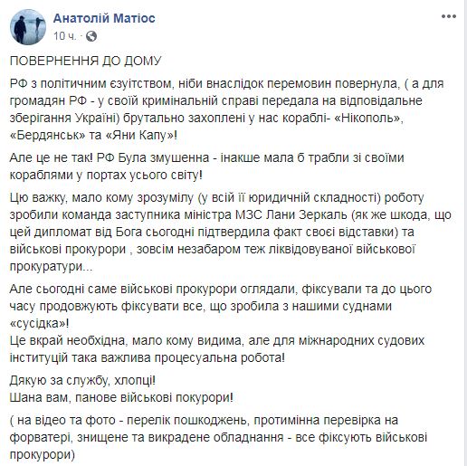 В сети появился документ с перечнем повреждений и недостающего имущества на украинских кораблях "Никополь", "Бердянск" и буксире "Яны Капу", которые были возвращены Россией. Его опубликовал бывший военный прокурор Анатолий Матиос в Facebook.