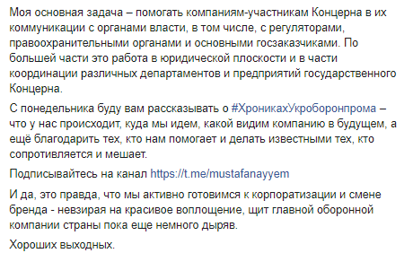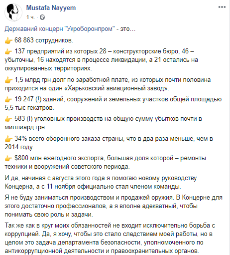Экс-нардеп Мустафа Найем, который был назначен на должность заместителя генерального директора государственного концерна "Укроборонпром", рассказал, чем будет заниматься на новом посту. Об этом он сообщил на своей странице в Facebook.
