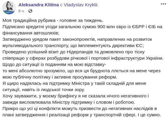"Мне совершенно ясно, что вся эта грязь льется на меня из-за моей публичной политики и активного продвижение реформ. Я искренне надеялась на поддержку министра (инфраструктуры - Ред.) в такой сложной для меня ситуации, даже с человеческой точки зрения. Хочу заметить, на моем брифинге я не сказала ничего негативного и всегда выражала министру поддержку и словом и работой" - написала Клитина.
