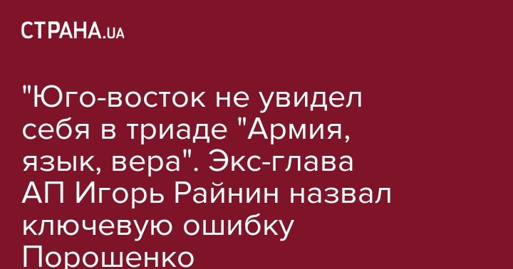 "На мой взгляд, юго-восток просто не увидел себя в этой триаде. При этом нельзя говорить, что данные регионы не патриотичны. Это абсолютно не так, достаточно много военных из этой части страны защищают Украину. Просто государственная политика как бы не втянула в себя людей. Они не почувствовали себя востребованными до конца, в том числе и во время избирательной кампании. Я одинаково люблю всю Украину от Закарпатья до Донбасса, мы единая страна. Но в ней каждый человек должен чувствовать себя вовлеченным в государственный процесс. А было слишком много решений, которые не были восприняты юго-востоком. Отсюда такие результаты голосования в этих регионах. Я об этом предупреждал", - сказал Райнин.