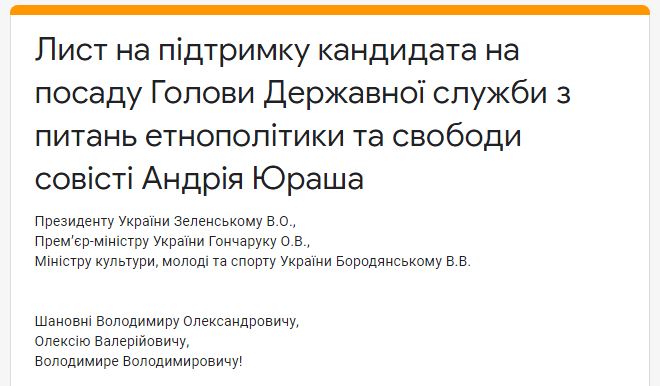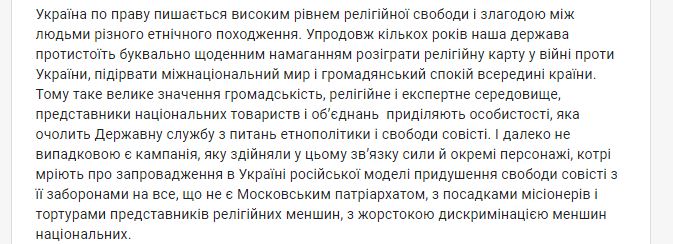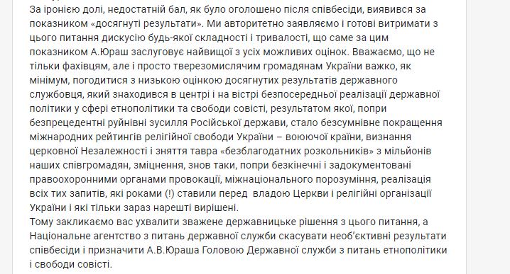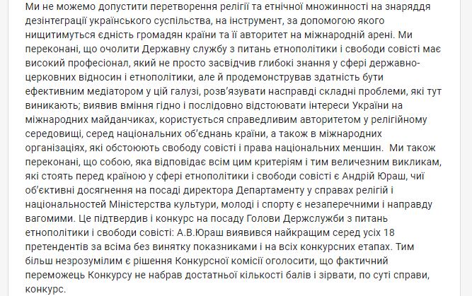 Письмо является реакцией на тот факт, что возглавлявший Департамент Минкульта по вопросам религий при Петре Порошенко Андрей Юраш не прошел собеседование на должность руководителя Государственной службы по вопросам этнополитики и свободы совести.
