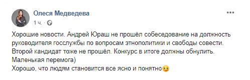 Ситуационное задание для претендентов на эту должность готовил известный донецкий религиовед Игорь Козловский (в конце 2017 года освобожденный по обмену из заключения "ДНР"), который состоял в Экспертном совете при ведомстве Юраша. Но в этом члены конкурсной комиссии не увидели конфликта интересов. От претендентов требовалось письменно ответить на вопрос: "ПЦУ получила Томос. Это вызвало больше вопросов, чем ответов. Какой должна быть с вашей точки зрения политика государства относительно Церкви?". А именно Юраш при президентстве Порошенко был одним из главных лоббистов ПЦУ и получения ею Томоса.