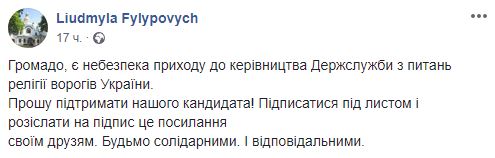 Авторы призывают избрать "достойного человека, который бы не просто засвидетельствовал глубокие знания в сфере государственно-церковных отношений и этнополитики, но и продемонстрировал способность быть эффективным медиатором в этой области, решать по-настоящему сложные проблемы, которые здесь возникают".
