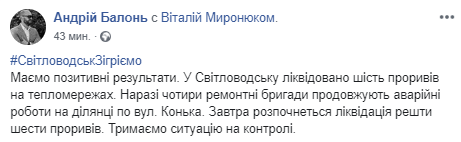 По словам главы Кировоградской областной государственной администрации (ОГА) Андрея Балоня в Facebook, уже было ликвидировано 6 прорывов на теплосетях.