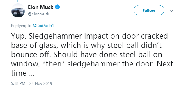 Генеральный директор компании Tesla Илон Маск объяснил, почему во время презентации его нового супурфутуристического электропикапа Cybertruck было повреждено стекло от тестовых ударов металлическим шариком. Об этом он написал на своей странице в Twitter.