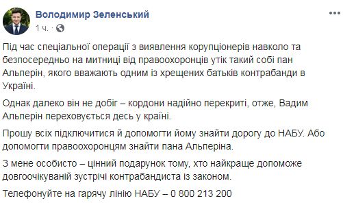 Во время специальной операции на таможне сбежал один из фигурантов дела о коррупции, известный предприниматель Вадим Альперин, сообщил президент Украины Владимир Зеленский на своей странице в Facebook.
