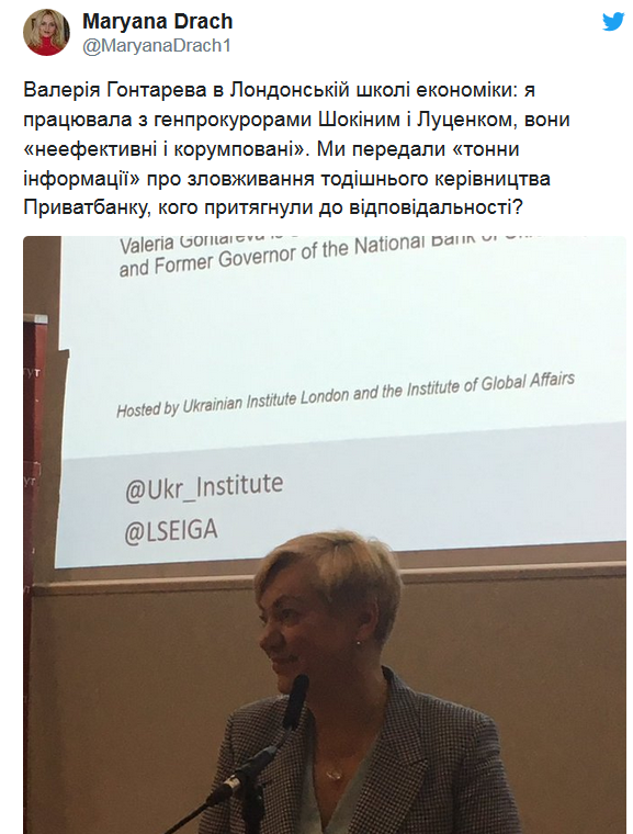 "Я работала с генпрокурорами Шокиным и Луценко, они неэффективны и коррумпированы. Мы передали тонны информации о злоупотреблениях тогдашнего руководства Приватбанка, кого привлекли к ответственности?", - в частности заявила с трибуны Валерия Гонтарева.