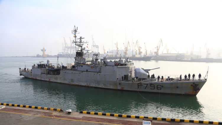 Вооружение: 100 мм пушка Mle68, пара 20 мм зенитных орудий F2, четыре пулемета калибра 12,7, четыре торпедных аппарата и четыре пусковые установки с ракетами Экзосет. Корабль пробудет в Одессе несколько дней.
