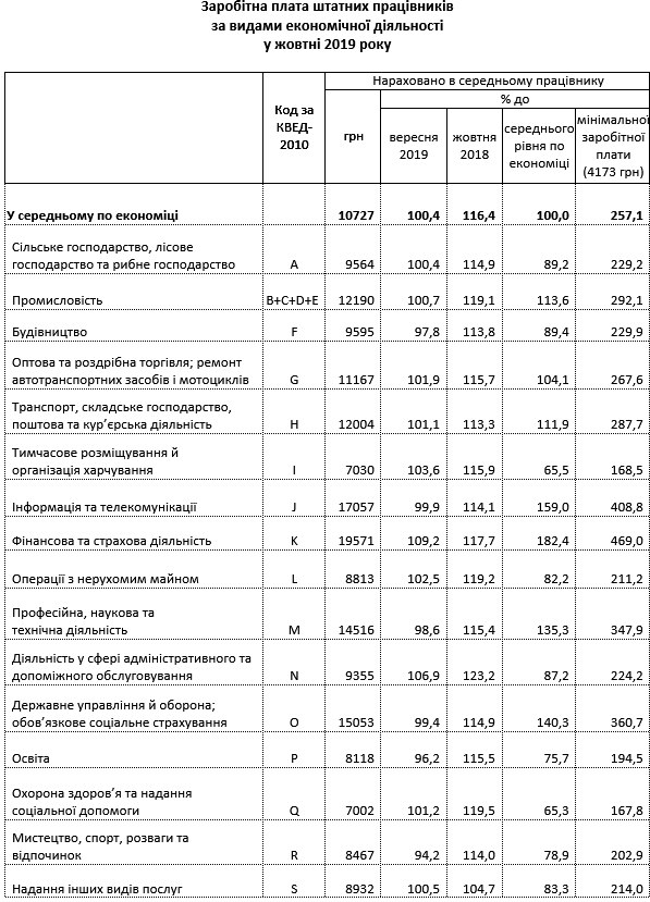 Уточняется, что средняя номинальная заработная плата штатных работников в октябре 2019 года составила 10 727 грн.