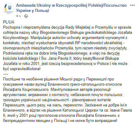 "Поспешное и опрометчивое решение городского совета в Перемышле об отмене названия улицы Блаженного греко-католического епископа Иосафата Коциловского. Манипулирование авторов резолюции аргументами, вырванными из контекста, нежелание услышать польских граждан украинской национальности - равноправных жителей Перемышля, в этот раз, к сожалению, победили. Посягательство на доброе имя Блаженного, а затем на решение Католической церкви и св. Иоанна Павла II, который в 2001 году провозгласил епископа Иосафата Блаженным, является беспрецедентным явлением в Польше и не может быть оправдано", - говорится в сообщении.