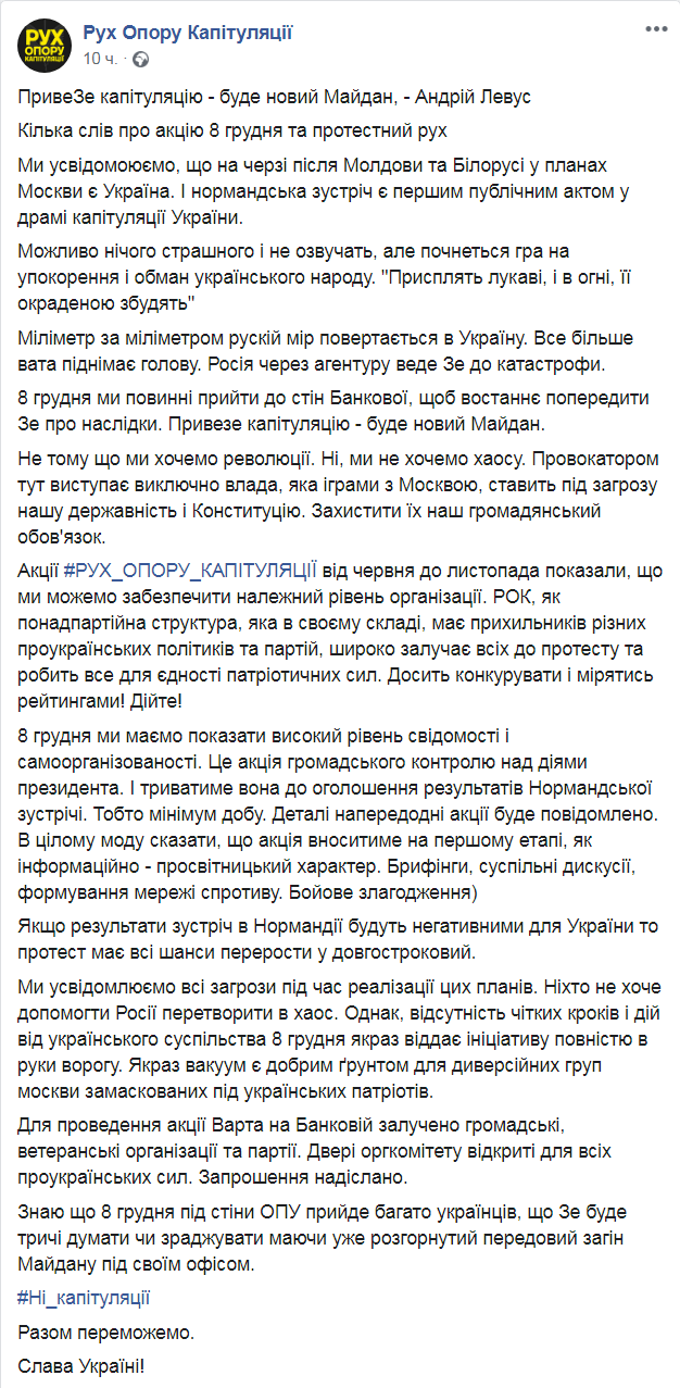 "Если результаты встречи в Нормандии (так написано в тексте - Ред.) будут негативными для Украины, то протест имеет все шансы перерасти в долгосрочный". - грозятся в "Движении сопротивления капитуляции".