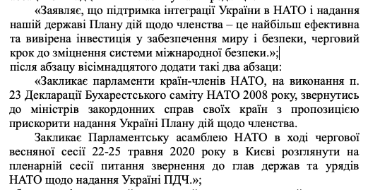 Верховная Рада Украины "Призывает парламенты членов-стран НАТО, в рамках исполнения п. 23 Декларации Бухарестского саммита НАТО 2008 года, обратиться к министрам иностранных дел своих стран с предложением ускорить предоставление Украине Плана действий по членству. Призывает Парламентскую ассамблею НАТО в ходе очередной весенней сессии 22-25 мая 2020 года в Киеве рассмотреть на пленарной сессии вопрос обращения к главам государств и правительств НАТО относительно предоставления Украине ПДЧ".