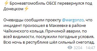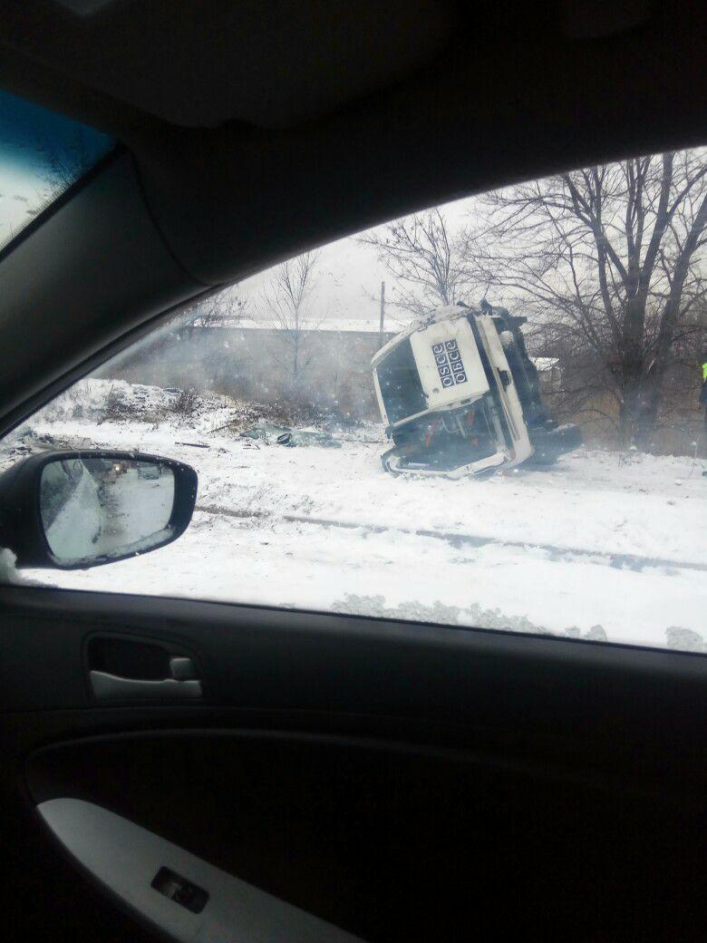 На снимке видно, что машина с логотипом мониторинговой миссии перевернутая лежит на обочине. Очевидцы сообщили, что инцидент произошел в районе Чайкинского кольца в Макеевке. Причиной аварии, очевидно, стали погодные условия. Всю ночь в населенном пункте шел сильный снегопад.