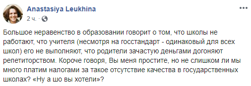 "Большое неравенство в образовании говорит о том, что школы не работают, что учителя (несмотря на госстандарт - одинаковый для всех школ) его не выполняют, что родители зачастую деньгами догоняют репетиторством. Короче говоря, Вы меня простите, но не слишком ли мы много платим налогами за такое отсутствие качества в государственных школах?" - написала она.