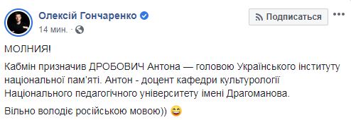 Кабмин назначил Антона Дробовича главой Украинского института национальной памяти (УИНП). Об этом сообщает нардеп от "Европейской солидарности" Алексей Гончаренко в Facebook.