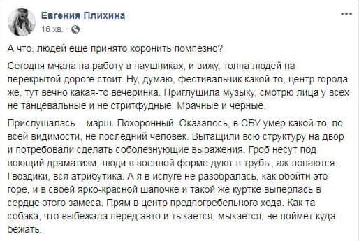 "А что, людей еще принято прятать помпезно? Сегодня неслась на работу в наушниках, и вижу - толпа людей на перекрытой дороге стоит. Ну, думаю, фестивальчик какой-то, центр города, здесь же вечно какая-то вечеринка. Приглушила музыку, смотрю - лица у всех не танцевальные и не стритфудные. Мрачные и черные. Прислушалась - марш. Похоронный. Оказалось, в СБУ умер какой-то, судя по всему, не последний человек. Вытащили всю структуру на улицу с требованием сделать сочувственные выражения. Гроб несут под воющий драматизм, люди в военной форме дуют в трубы так, что лопаются. Гвоздики, вся атрибутика..." - написала редактор.