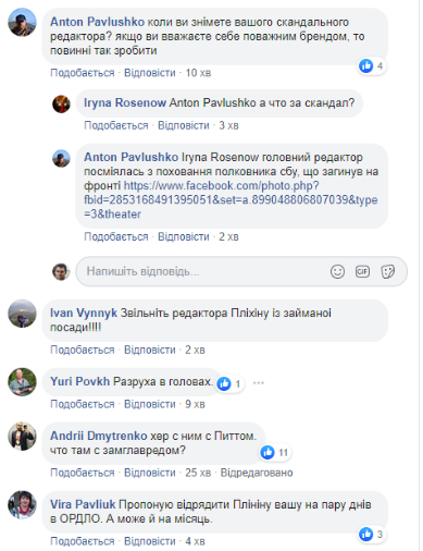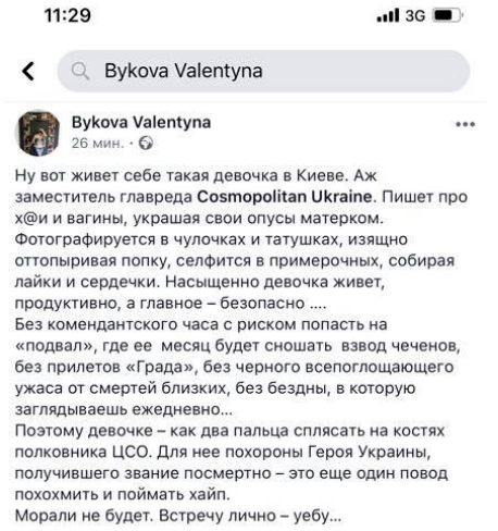 Заместитель главреда журнала Cosmopolitan Ukraine Евгения Плихина высмеяла в Facebook похороны полковника ЦСО "Альфа" СБУ, 37-летнего снайпера Дениса Волочаевана, который погиб на Донбассе, выполняя боевую задачу.