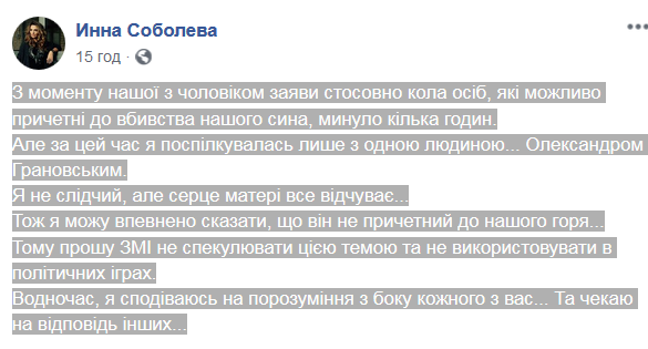 Инна Соболева, жена депутата Киевского облсовета Вячеслава Соболева и мама убитого трехлетнего ребенка заявила, что говорила с экс-нардепом Александром Грановским и считает, что он не причастен к убийству ее сына, Сашеньки. Об этом она написала в Facebook.