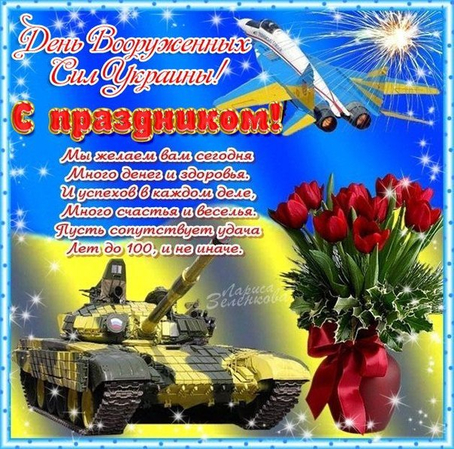 Поздравляю с профессиональным праздником - с Днем Вооруженных Сил Украины. Желаю успехов в служении украинскому народу и крепкого здоровья. С праздником!