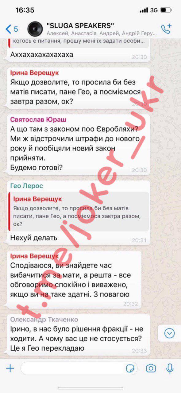 Как выяснилось, причиной послужила переписка в чате "Слуги народа", где Лерос позволил себе матерные выражения в адрес Верещук. Та попросила извинений, но нардеп дал понять, что их не будет. В сеть попали скрины тех самых сообщений, вызвавших бурю в зале.