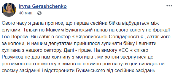 "Он (Бужанский - Ред.) забежал в сектор "Европейской солидарности", затащил его (Лероса - Ред.) за колонны, и нашим депутатам пришлось останавливать драку", - написал нардеп Ирина Геращенко в Facebook.