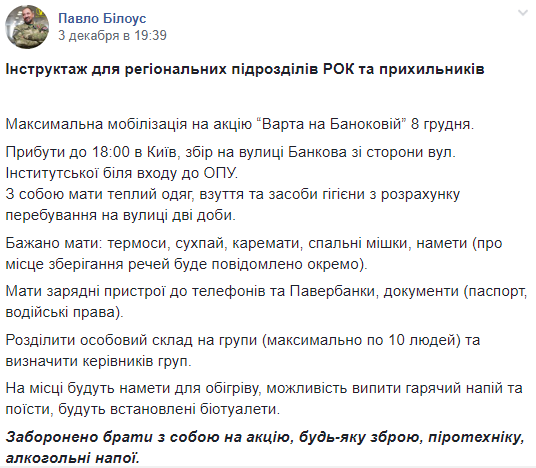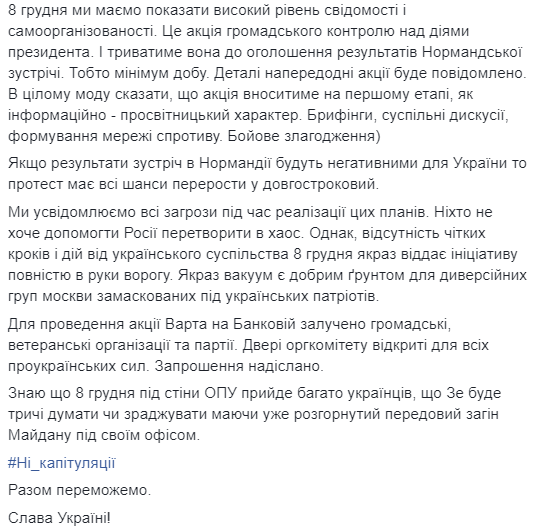 В тот же день РОК объявил акцию на Банковой прямо под окнами президента, которая начнется вечером и продлится как минимум до вечера 9 декабря, когда объявят результаты Нормандской встречи.