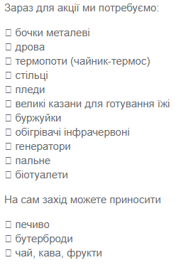 Майдановцы уже собирают в соцсетях металлические бочки, дрова, чайники-термосы, стулья, пледы, большие казаны для приготовления еды, буржуйки, обогреватели инфракрасные, генераторы, топтиво, биотуалеты.