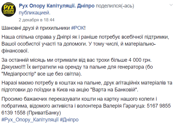 Участники акции организовали региональные группы "РОК" в Черновцах, Львове, Ивано-Франковске, Запорожье, Тернополе, Буковины, Днепра, Сумщины, Волыни в Facebook, и открыли сбор средств на счета волонтеров в "Приватбанке".