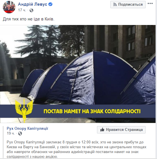 Главное условие установки палатки - фото на фоне палатки, выставленное в Facebook с хэштегом  #Ні_капітуляції та #Рух_опору_капітуляції