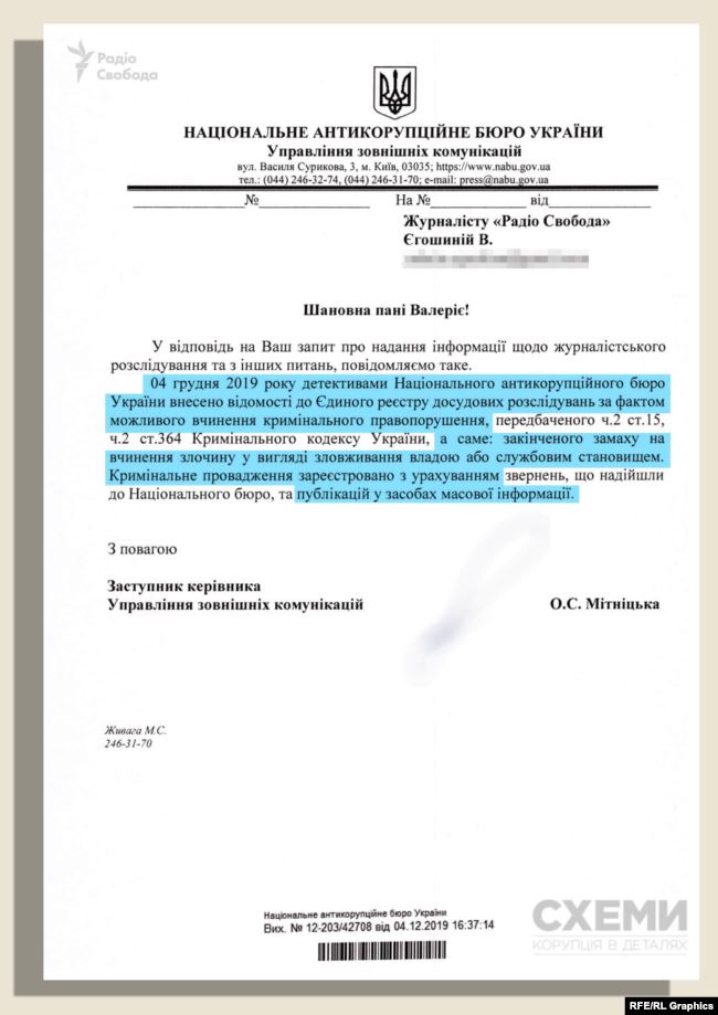 "4 декабря детективами НАБУ внесены сведения в ЕДРР по факту возможного совершения уголовного преступления, предусмотренного ч.2. ст.15, ч.2. 364 Уголовного кодекса Украины, а именно: законченного покушения на совершение преступления в виде злоупотребления властью или служебным положением", - говорится в официальном ответе Антикоррупционного бюро на запрос Радио Свобода.