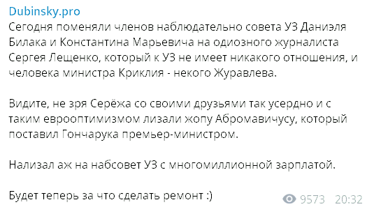 Автор канала в непарламентских выражениях делает вывод, что такая кадровая перестановка стала результатом тесных отношений экс-нардепа Лещенко с нынешним руководителем "Укроборонпрома" Айварасом Абромавичусом, "который поставил Гончарука премьер-министром".