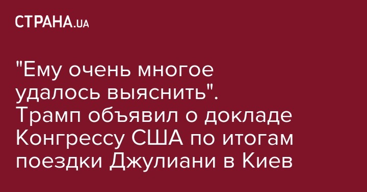 Президент США Дональд Трамп заявил, что его адвокат Рудольф Джулиани в ходе визита в Украину многое выяснил для своего антикоррупционного расследования и представит о нем доклад Конгрессу. Об этом сообщает ТАСС.