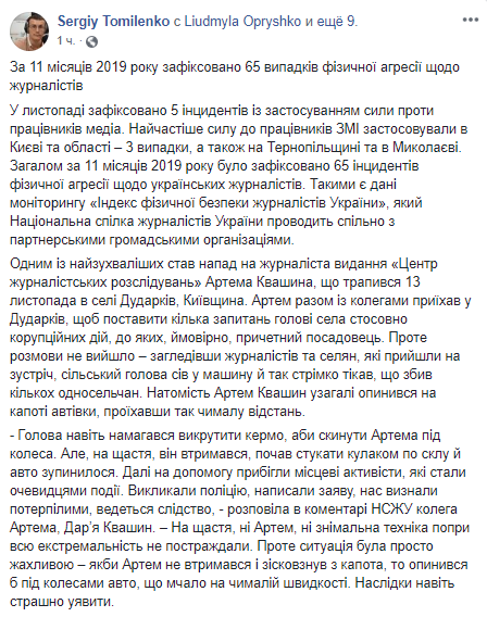 "Глава даже пытался выкрутить руль, чтобы сбросить Артема под колеса. Но, к счастью, он удержался, начал стучать кулаком по стеклу и авто остановилось. Далее на помощь прибежали местные активисты, которые стали очевидцами происшествия. Вызвали полицию, написали заявление, нас признали потерпевшими, ведется следствие", - рассказала в комментарии НСЖУ коллега Артема, Дарья Квашин. - К счастью, ни Артем, ни съемочная техника несмотря на всю экстремальность не пострадали. Однако ситуация была просто ужасной - если бы Артем не удержался и соскользнул с капота, то оказался бы под колесами авто, мчавшегося на большой скорости. Последствия даже страшно представить".