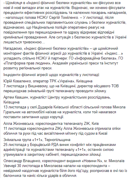 "Ежемесячно в "Индексе физической безопасности журналистов" мы фиксируем все новые и новые случаи атак на журналистов. В то же время, мы хотим фиксировать прецеденты эффективных расследований и надлежащих наказаний нападающих", - отмечает председатель НСЖУ Сергей Томиленко. - В ноябре, после проведения специальных парламентских слушаний по безопасности журналистов, отмечаем, что Национальная полиция оперативно реагирует на сообщения о препятствовании и сразу открывает соответствующие уголовные производства. Но ситуация с безопасностью журналистов в Украине остается тревожной".