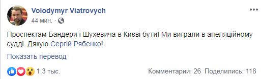"Проспектам Бандеры и Шухевича в Киеве быть! Мы выиграли в апелляционном суде", - написал он.