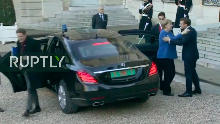 В отличие от лидеры Германии Ангелы Меркель, которую автомобиль представительского класса подвез прямо ко входу, Зеленского подвезли на минивэне Renault Espace и высадили далеко от ступенек, где его ждал президент Франции Эммануэль Макрон.
