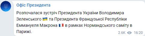 В Париже началась встреча президента Украины Владимира Зеленского и президента Французской Республики Эммануэля Макрона, которая проходит в рамках Нормандского саммита. Об этом сообщает Офис президента.