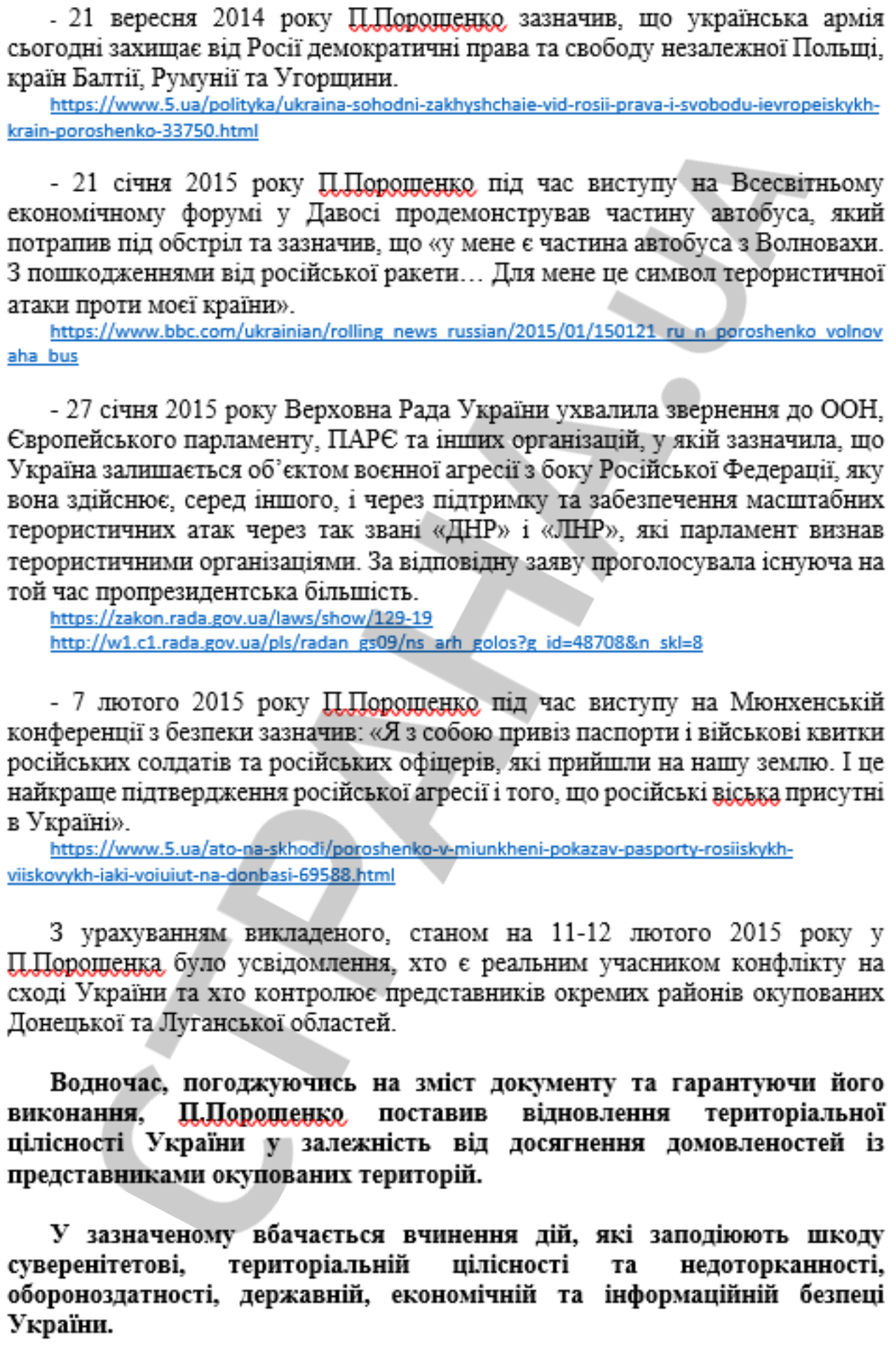 Это обвинения Порошенко в госизмене при подписании Минских соглашений в феврале 2015 года.