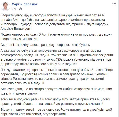 Вместе с тем, член комитета Верховной Рады по вопросам аграрной и земельной политики Сергей Лабазюк (внефракционный) написал на своей странице в Facebook, что в четверг в парламенте планируют проголосовать во втором чтении и в целом за законопроект о рынке земли.